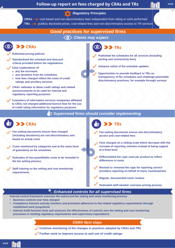The European Securities and Markets Authority (ESMA) has published a Follow Up to the Thematic Report on fees charged by Credit Rating Agencies (CRAs) and Trade Repositories (TRs). |