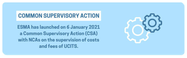 ​ESMA has launched on 6 January 2021 a Common Supervisory Action (CSA) with NCAs on the supervision of costs and fees of UCITS.The CSAs aim is to assess the compliance of supervised entities with the relevant cost-related provisions in the UCITS framework, and the obligation of not charging investors with undue costs. It will be conducted during 2021.