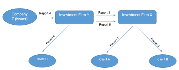 Assuming for the purposes of this example that Investment Firms X and Y are dealing on own account, the reports that need to be made by X and Y are indicated by Reports no. 1 – 6 in the figure below. The direction of the arrows indicates the direction of flow of the financial instruments.