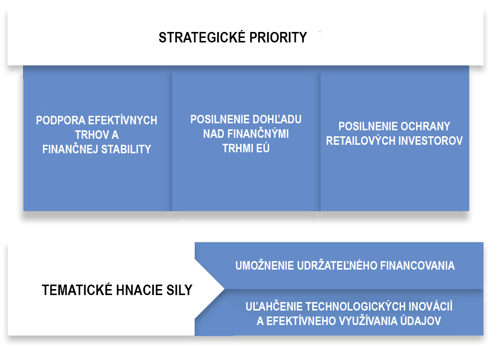 ESMA plní svoje poslanie tým, že sa zameriava na tri strategické priority a riadi sa dvoma kľúčovými témami formulovanými v stratégii ESMA na roky 2023 – 2028. ESMA plánuje vykonávať túto stratégiu postupne v nasledujúcich rokoch, pričom sa zameria na strategické priority a tematické faktory a zároveň zohľadní vývoj na trhu a vznikajúce riziká, ako aj nové právne mandáty a dostupné zdroje v orgáne ESMA aj v príslušných vnútroštátnych orgánoch.
